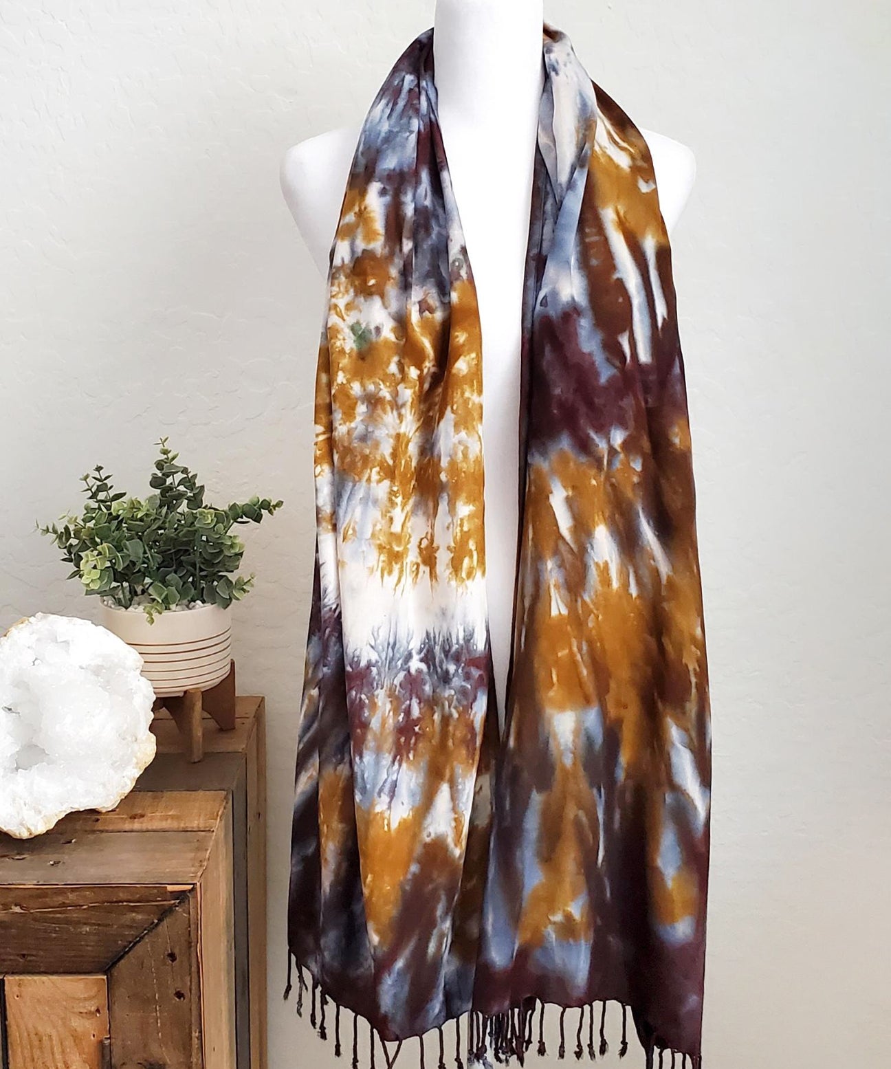 Our scarves are the most luxurious, soft thing to touch your skin. They are nice and lightweight, making them ideal for a number of uses. They can be worn over a mask as a fashionable face covering, they make wonderful wraps for the head or body, or they can be worn the traditional way around the neck. Features fringe detailing.